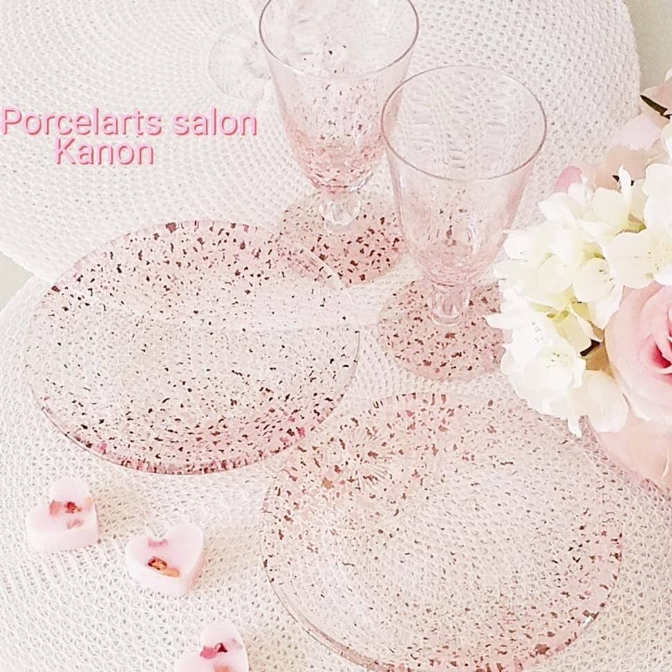 これからの季節にぴったりな、お上品で可愛いピンクコンフェッティ柄でプレートとグラスをお作りしました^^